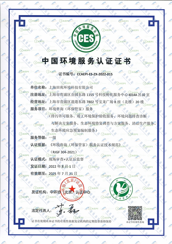 《中國環(huán)境服務認證證書【環(huán)保管家一級】》